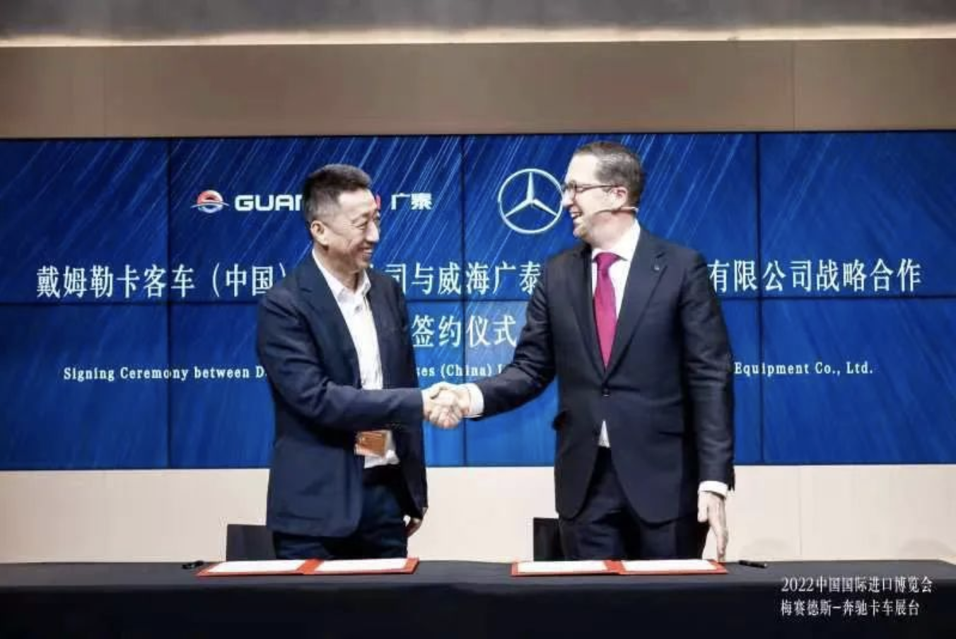 2022年11月5日,在第五届中国国际进口博览会现场,乐竞体育(中国)官方网站 - 登录入口(以下简称“威海乐竞体育”)董事长李文轩与戴姆勒卡客车(中国)有限公司(以下简称“戴姆勒卡客车(中国)”)首席执行官秦坦签订了《战略合作框架协议》。双方在之前良好合作的基础上,正式建立战略合…