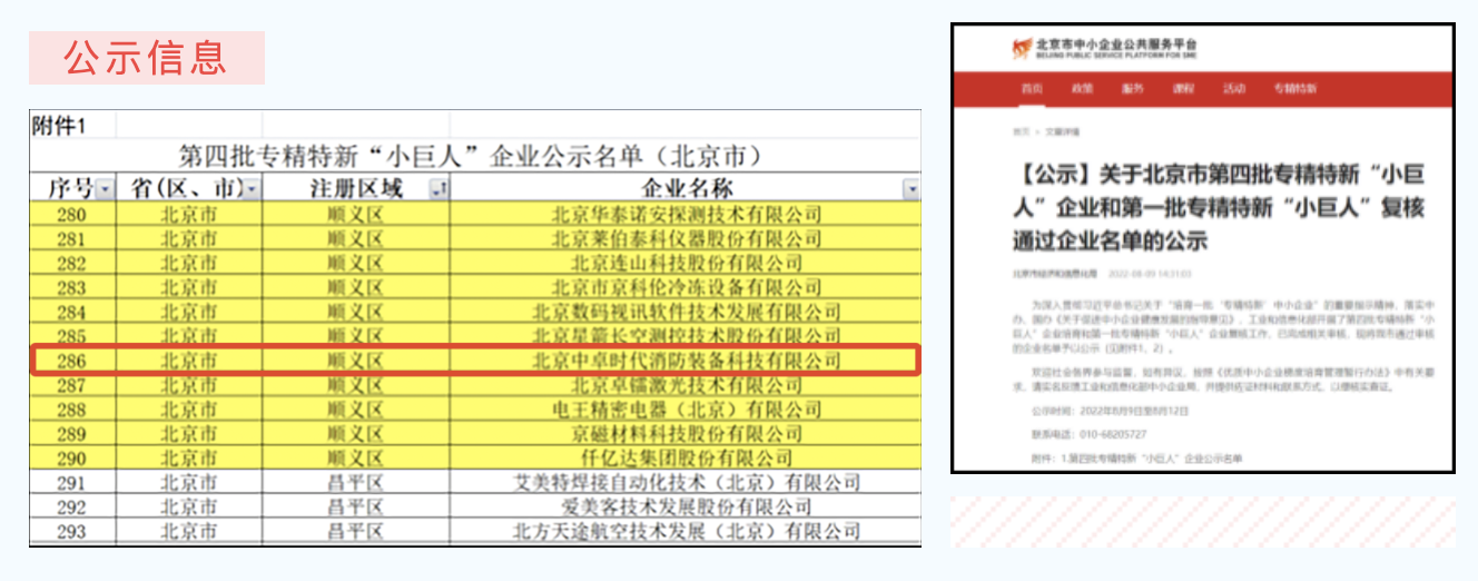 近期,北京市中小企业公共服务平台公示“关于北京市第四批专精特新‘小巨人’企业名单”,北京中卓时代消防装备科技有限公司(以下简称:中卓时代)成功入选第四批国家级专精特新“小巨人”企业。 专精特新中小企业具有专业化、精细化、特色化、新颖化等四大特征。专精特新“小巨人…